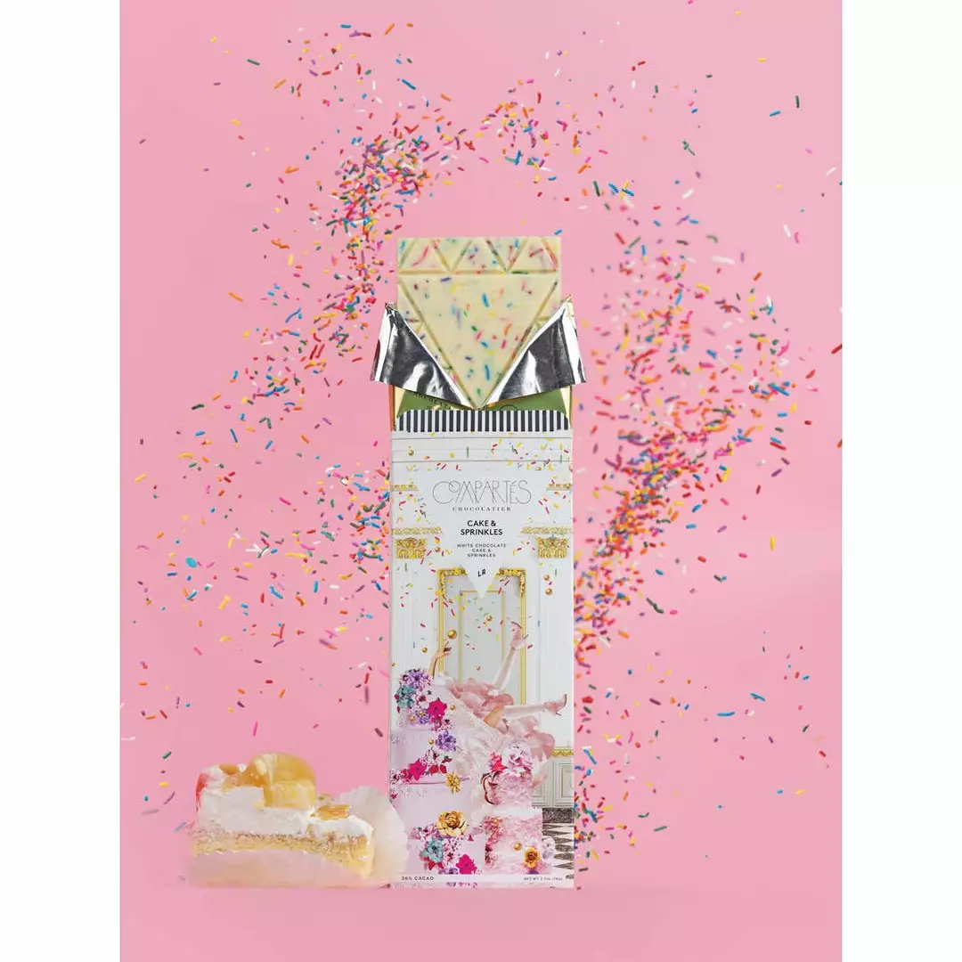 Compartés Chocolatier Birthday Cake gourmet white chocolate bar makes any celebration sweeter. This festive, luxury chocolate bar is made with three types of vanilla beans, moist & delicious fresh white birthday cake mix, and tons of colorful sprinkles! So good, you won’t be able to get enough! Handmade in our Los Angeles chocolate kitchens.
