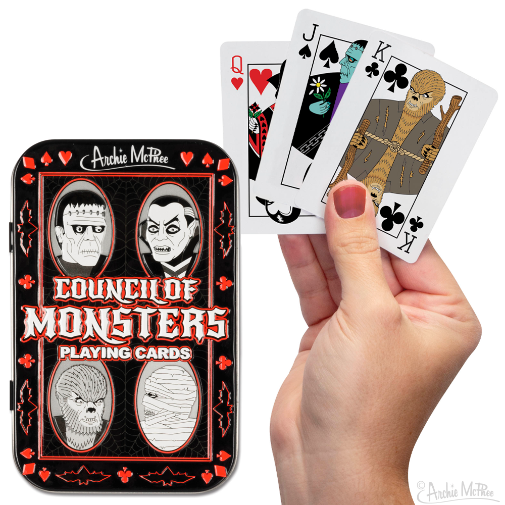 This is the official card deck of the Council of Monsters. A vampire, werewolf, mummy and monster got together and formed a club to come up with monster bylaws, certifications and conventions. These 2-1/2″ x 3-1/2″ (6.4 cm x 8.9 cm) beautifully illustrated cards have unique face cards, a different monster for every suit and two jokers that are sure to please anyone who loves monsters. Illustrated tin.