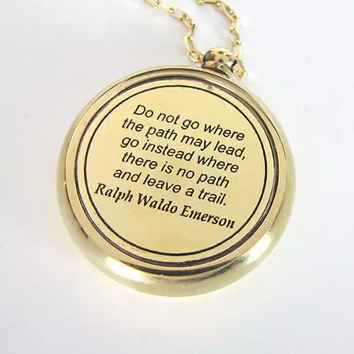 A working compass with an inspirational message engraved on the back threaded onto a long gold cable chain.
